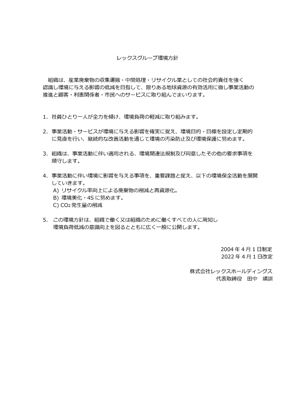 ISO認証取得 当社では、環境保全の一貫として環境マネジメントシステムの国際規格であるISO14001の認証取得を積極的に推進しています。 ISO14001:2015 登録証・登録証付属書 レックスグループ(PDF)有効期限:2025年11月17日 環境方針(2022年4月1日 改定) 環境方針 2022.4.1(PDF)